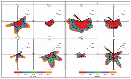 Another useful analysis was performed using the percentileRose function. This function calculates and displays percentile levels of pollutant concentrations according to wind direction. One or more percentile values can be specified, which are then plotted either as solid areas or lines. By default, the data is displayed in 10° segments, which provides a detailed overview of the distribution of concentrations according to wind directions. Such visualization is extremely useful for identifying potential sources of pollution—including those that only show up at high percentile values. The use of this function is a suitable addition to the Boxplot graph (Figure 4), where we can observe high percentile values. The highest percentile values (75th–95th percentile) were observed for PM10 and PM2.5–10 from the south/southeast direction, i.e., from the direction of the three-arm intersection (Figure 8a). The black line in the graphs represents the average of the concentrations in that direction, with the largest averages observed from the southeast/south (Figure 8a). High concentrations (75th–95th percentile) of NO2 were prevalent at the three-arm intersection from the southeast direction, which is directly from the intersection (Figure 8a). In the case of the roundabout, the highest concentrations were observed from the west/southwest direction (75th–95th percentile), mainly for PM (Figure 8b). High NO2 concentrations were observed from the southeast direction of the roundabout, which corresponds to the directions of origin of concentrations at the three-arm intersection (Figure 8b), but also from the southwest direction. It is also important to draw attention to the fact of a different range of concentrations for polluting substances. The scale is smaller at the roundabout for solid particles and, conversely, larger for NO2 (Figure 8).