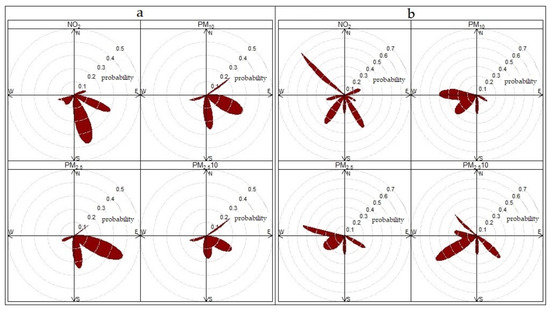 High concentrations at the intersection with three arms are mainly influenced by southeasterly wind directions (in the direction from the intersection). Conversely, in the case of the roundabout, high concentrations from the west/southwest dominate, indicating a source other than road traffic at the intersection in question. Also, the probability of occurrence of these concentrations is higher than from other directions (Figure 9b). For NO2, high concentrations were also observed from the southeast, with a higher probability of occurrence (Figure 9b).
