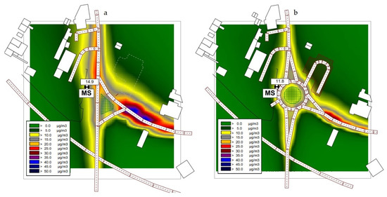Modeled dispersion of average daily concentrations of the pollutant PM10: (a) three-arm intersection; (b) roundabout.
