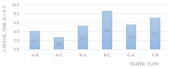 The largest increase in average travel times was recorded on the crossing from arm B towards arm C by a value of 8.6 s. The smallest increase, 2.6 s, occurred for the movement from arm A to arm C. Overall, the roundabout increased travel times by an average of 5.5 s. The results are presented in the following Figure 14.