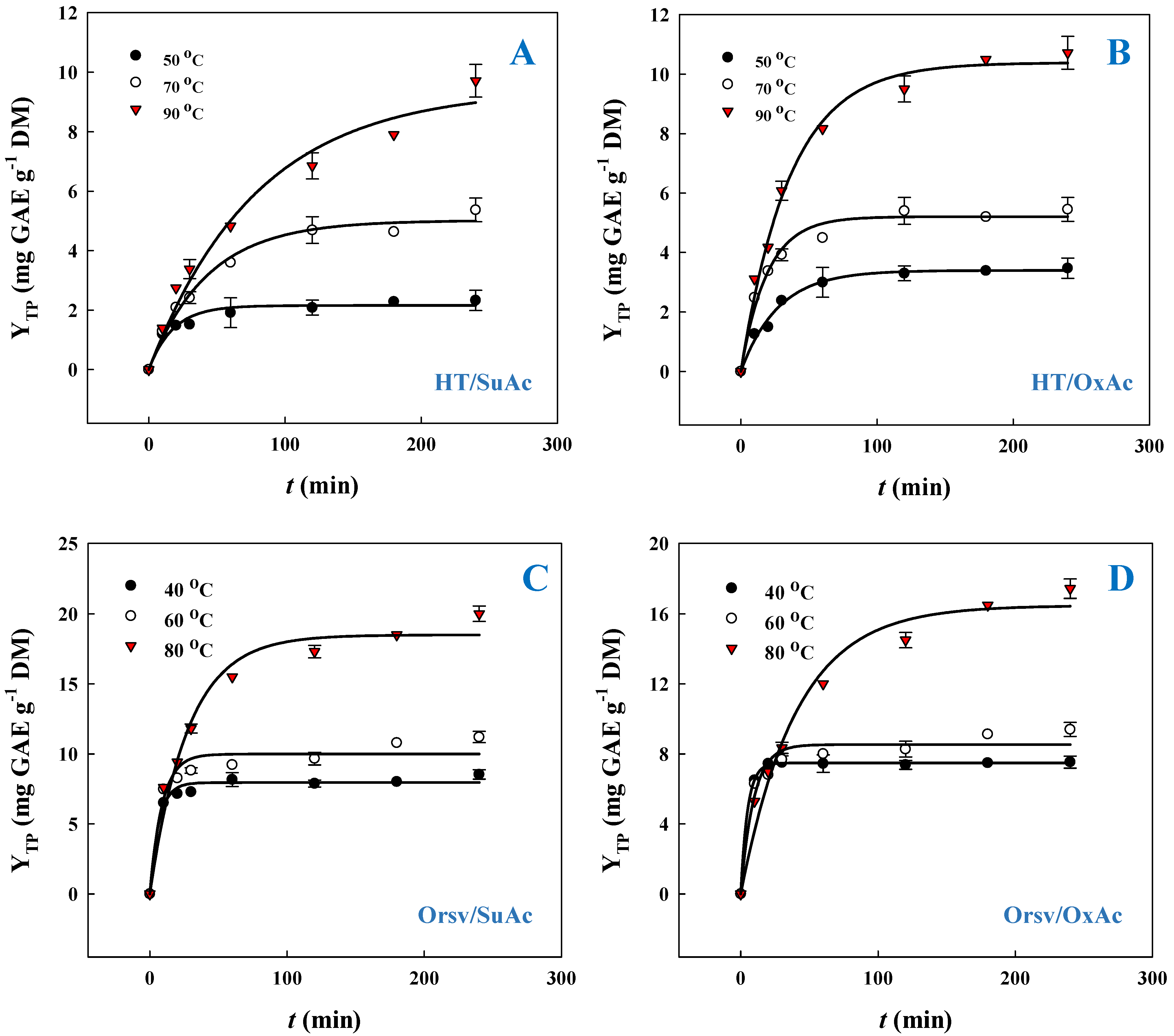Treatment | T (°C) | R2 * | k (min−1) × 10−3 | YTP(s) (mg GAE g−1 DM) |