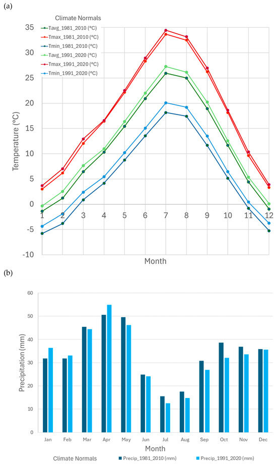 Figure 1. (a) Average, maximum, and minimum monthly temperature 1981–2010 and 1990–2020 climate normals for Salt Lake City Airport and (b) average monthly precipitation 1981–2010 and 1990–2020 climate normals for Salt Lake City Airport.