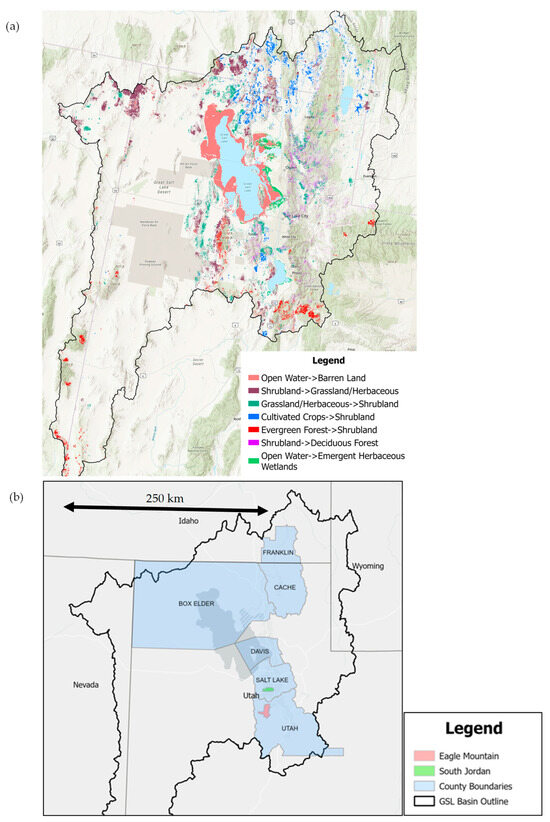 Figure 2. (a) Distribution of most abundant land use land class (LULC) conversions from 1985 to 2023 based on Landsat National Land Cover Dataset (NLCD) for the Great Salt Lake Basin and (b) map showing locations of areas of interest within the GSL basin: six counties—Salt Lake, Utah, Davis, Box Elder, Cache, and Franklin—and two cities: Eagle Mountain and South Jordan.
