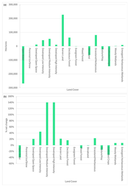 Figure 3. (a) Net change in hectares and (b) percentage change in NLCD land classes in the Great Salt Lake Basin from 1985–2023.