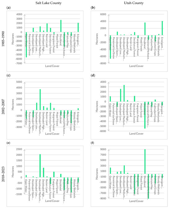 Figure 4. Net change in area (hectares) from 1985 to 1990 in (a) Salt Lake County and (b) Utah County, 2002–2007 in (c) Salt Lake County and (d) Utah County, and 2018–2023 in (e) Salt Lake County and (f) Utah County.