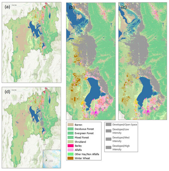 Figure 5. Cropscape land use/land class classifications for (a) 2008 Great Salt Lake Basin, (b) 2008 Salt Lake and Utah County’s most populous areas, (c) 2023 Salt Lake and Utah County’s most populous areas, and (d) 2023 Great Salt Lake Basin with location in USA.