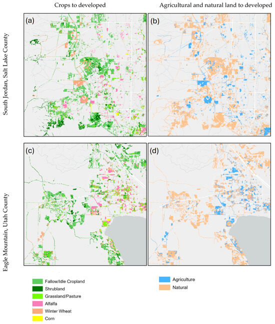 Figure 9. Selected areas portraying most frequent types of land converted (2008–2023) to developed land in (a,b) South Jordan and (c,d) Eagle Mountain.