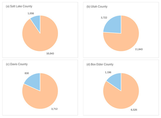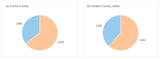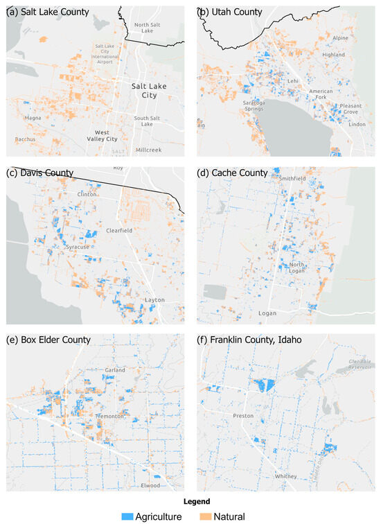 Figure 10. Conversion to developed land from natural and agricultural land (2008–2023) in the most developed sections of (a) Salt Lake County, (b) Utah County, (c) Davis County, (d) Cache County, (e) Box Elder County, and (f) Franklin County, Idaho.