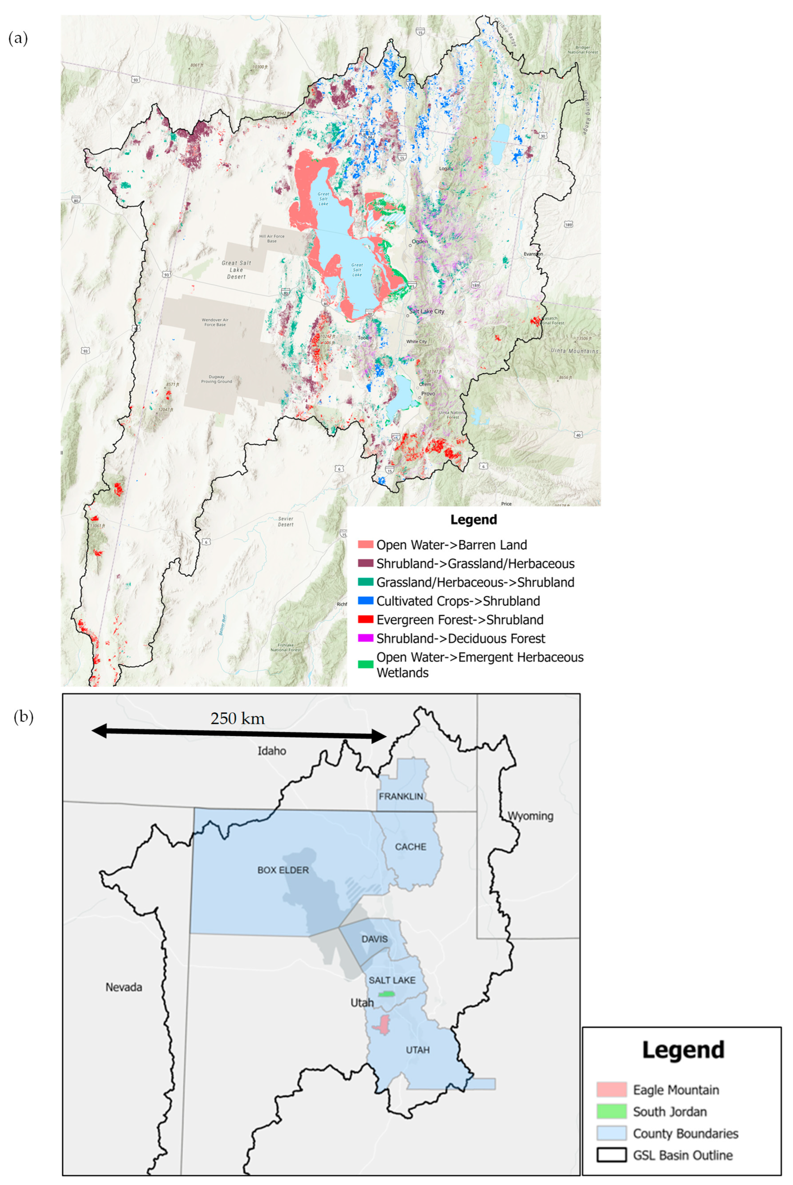 Howey, T.; North, L.; Kerry, R. Land Use and Land Cover Change and Potential Implications for Water Levels of the Great Salt Lake. Environments 2025, 12, 381. https://doi.org/10.3390/environments12100381