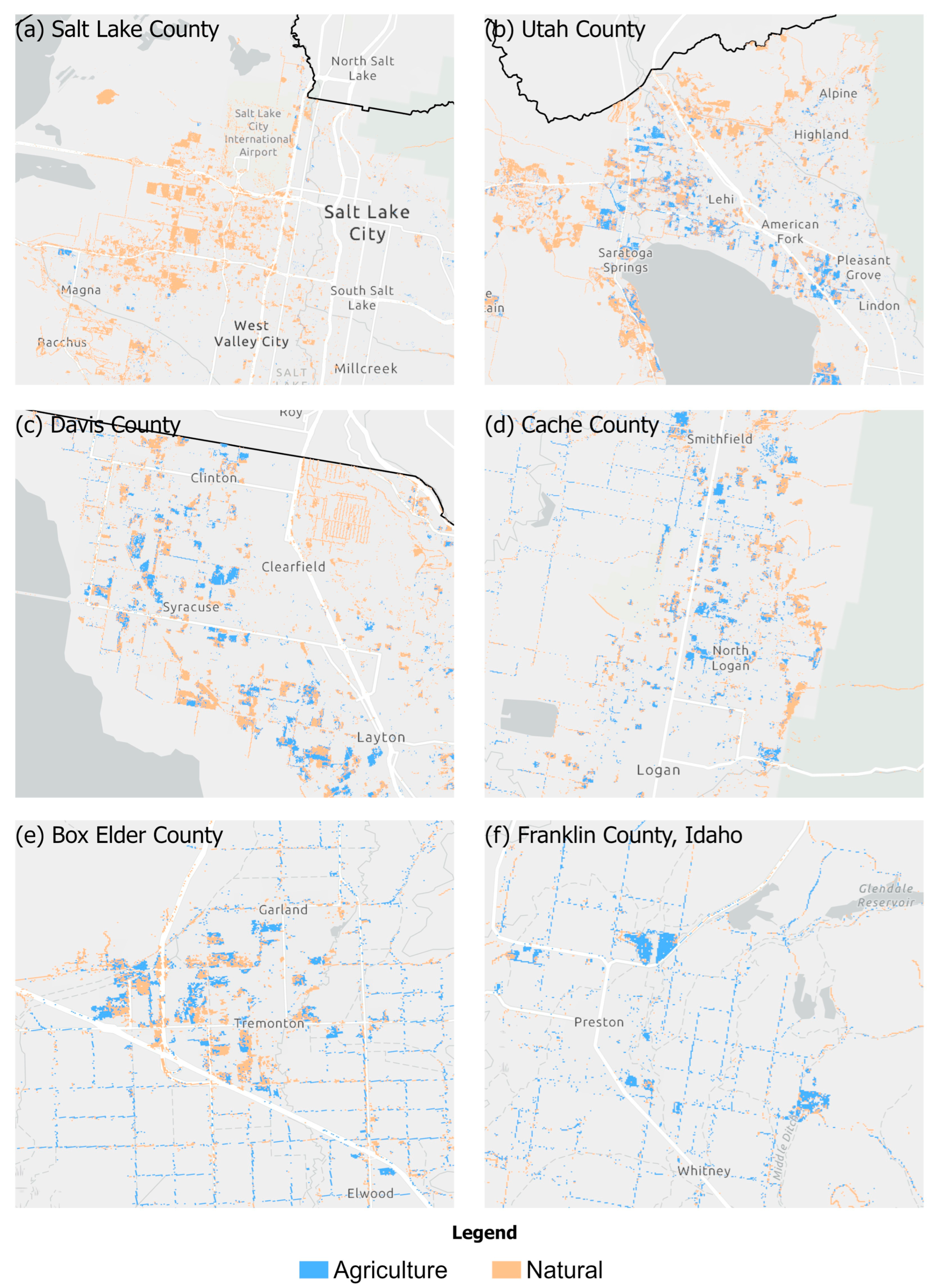 - Zesiger, C.; Barker, B.; Null, S.; Creech, E.; Yost, M.; Larsen, R.; Dallin, J. Agriculture Water Use and Economic Value in the Great Salt Lake Basin [Fact Sheet]; Utah State University Extension: Logan, UT, USA, 2023. [Google Scholar]