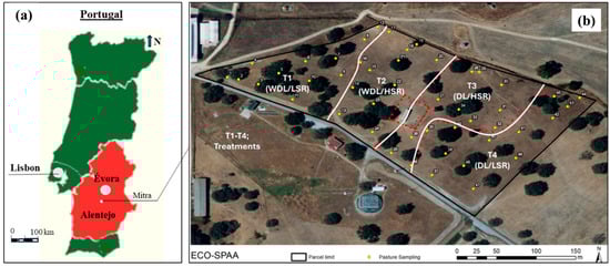Experimental field (“Eco-SPAA”), located in Mitra farm (University of Évora), Alentejo region of Portugal (a). The treatments (T1, T2, T3, and T4) and 48 pasture sampling areas (b). WDL—Without dolomitic limestone application; DL—With dolomitic limestone application; LSR—Low stocking rate; HSR—High stocking rate.