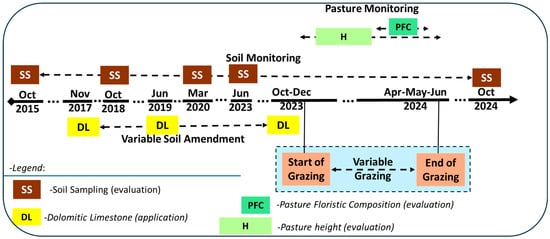 The soil of the experimental field is a Cambisoil [19], derived from granite, with a slightly acidic pH [12]. Soil monitoring includes topsoil (0–0.30 m) sampling, carried out at the start of the global project (2015) and then at an interval of 2 or 3 years (SS, Figure 2). Throughout this long-term study (2015–2024), dolomitic limestone (1.5–2.0 tons ha−1; DL; Figure 2) was periodically applied to half of the study area (plots T3 and T4). The tree layer of the experimental area consists of holm oaks (Quercus rotundifolia Lam.) and cork oaks (Quercus suber L.), with an average density of around 10 trees ha−1. These dryland biodiverse pastures are grazed by sheep at different stocking rates depending on the treatment. Grazing began in December 2023 and continued until June 2024.