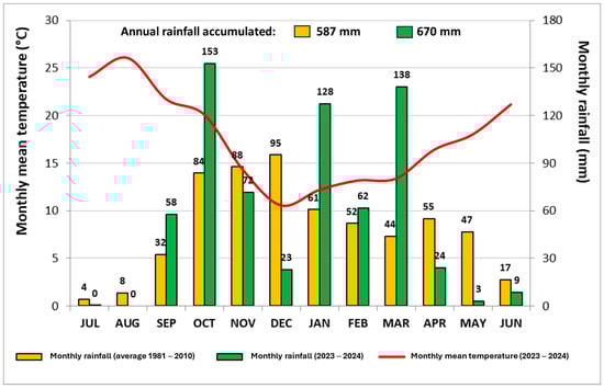 Thermo-pluviometric diagram of Meteorological Station of Mitra (Évora, Portugal) between July 2023 and June 2024. The evolution of the average value of the monthly rainfall in a 30-year period (between 1981 and 2010) is also presented.