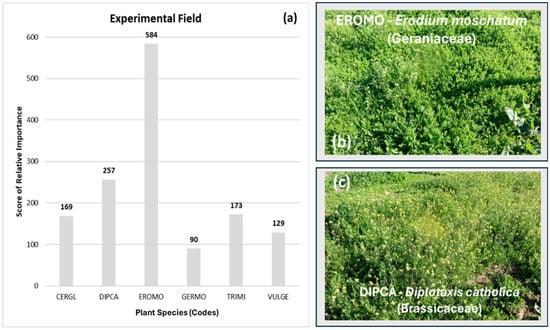 Score of the Relative Importance of plant species with the greatest representation in the experimental field (a); pictures of two species with major representation: Erodium moschatum (b) and Diplotaxis catholica (c).