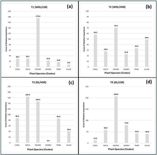 Score of the Relative Importance of plant species with the greatest representation in each plot of the experimental field: (a) treatment 1; (b) treatment 2; (c) treatment 3; (d) treatment 4.