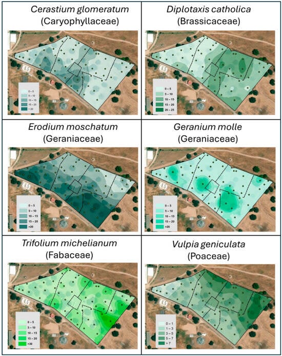 The spatial distribution of the six species with the greatest representation within the experimental field was characterized by estimating their occurrence at unsampled locations. To obtain a continuous variable, each location was defined as a 1 m2 unit, thereby enabling the computation and mapping of species densities.