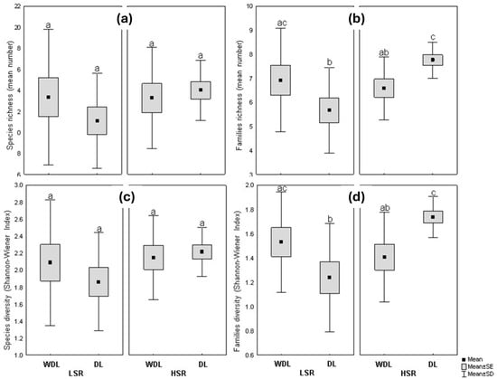 Boxplot of the floristic community metrics (species richness (a); families richness (b); species diversity (c) and families diversity (d)), according to treatment: T1 (without dolomitic lime and low stocking rate, WDL/LSR), T2 (without dolomitic lime and high stocking rate, DL/HSR), T3 (with dolomitic lime and high stocking rate (DL/HSR), and T4 (with dolomitic lime and low stocking rate, DL/LSR). The letters refer to the results of the Mann–Whitney non-parametric test. Different letters represent significant differences (p < 0.05).