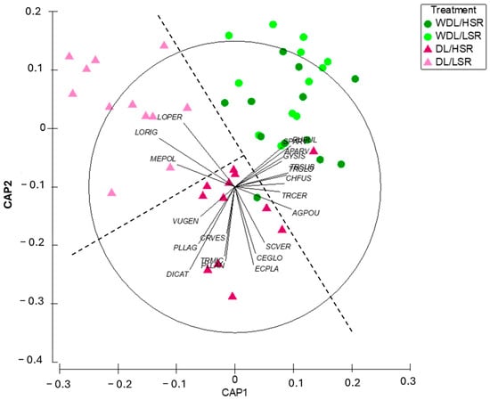 Ordination diagram of the “Canonical Analysis of Principal Coordinates” (CAP) for the floristic inventories, based on species composition and using the Bray-Curtis similarity coefficient. Species with higher correlations with the CAP axes were overlaid in the diagram. (WDL/LSR: without lime application/low stocking rate; WDL/HSR: without lime application/high stocking rate; DL/HSR: with lime application/high stocking rate; DL/LSR: with lime application/low stocking rate).