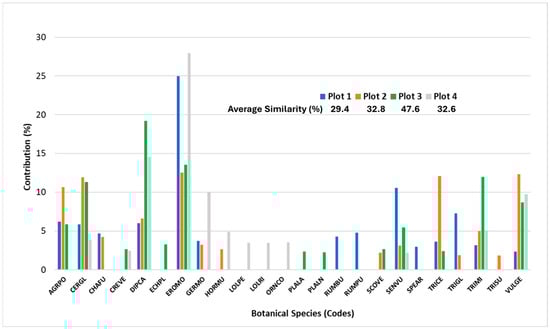 The “similarity percentage” (SIMPER) was used to identify which species and families contribute most to differentiating PFC in each treatment (Figure 10 and Figure 11, respectively). The more abundant a species or family is within a group, the more it will contribute to the intra-group similarities. Based on this analysis, Erodium moschatum is the species with the greatest contribution to similarity in treatments 1 (25.0%) and 4 (28.0%), both with low SR. In treatment 1, in addition to the aforementioned species, Senecio vulgaris (10.5%) and Trifolium glomeratum (7.3%) make a significant contribution. In treatment 4, Diplotaxis catholica (14.5%), Geranium molle (10%), and Vulpia geniculata (9.7%) show a relevant contribution. On the other hand, in the plot amended with lime and HSR (T3), Diplotaxis catholica made the greatest contribution to similarity (19.2%), followed by Erodium moschatum (13.5%) and Trifolium michelianum (12.0%). In regard to treatment 2 (uncorrected and high SR), no single species stands out, but 5 species make a similar contribution: Erodium moschatum, Vulpia geniculata, Trifolium cernuum, Cerastium glomeratum, and Agrostis pourretti (12.5%, 12.3%, 12.1%, 11.9% and 10.6%, respectively).