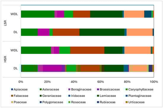 Relative coverage (%) of floristic families in each plot, considering the application of dolomitic lime and stocking rate: without dolomitic lime/low stocking rate (WDL/LSR), without dolomitic lime/high stocking rate (WDL/HSR), with dolomitic lime/low stocking rate (DL/LSR), and with dolomitic lime/high stocking rate (DL/HSR).