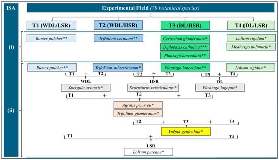 T1 to T4—Treatments; IV—Indicator value of Indicator Species Analysis (ISA); NA—Not applicable.
