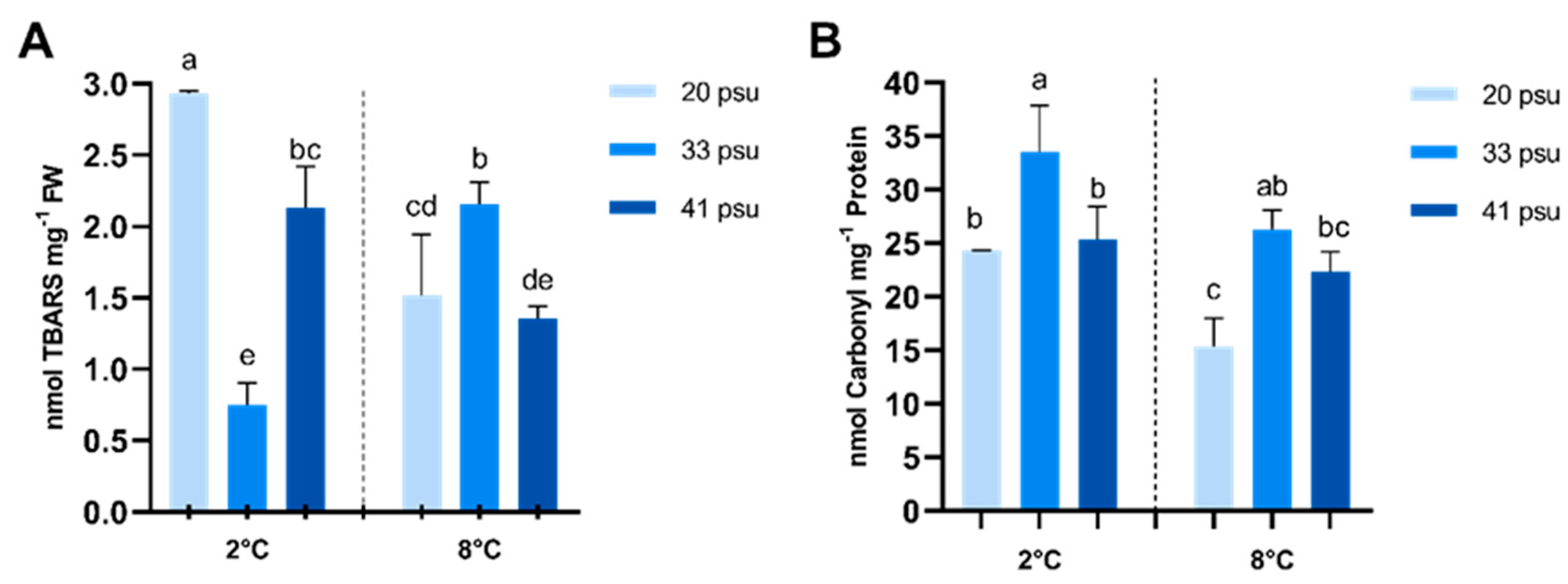 Figure 5. Effect of temperature and salinity on oxidative damage to macromolecules in A. utricularis. (A) Quantification of peroxidized lipids (TBARS). (B) Quantification of protein carbonylation. The determination of oxidative damage parameters was conducted at 2 °C (control) and 8 °C, at three salinity levels: 20 (hyposaline), 33 (control), and 41 psu (hypersaline). The data are presented as mean ± SD, with n = 3. Lowercase letters represent significant differences between treatments (p < 0.00046 and p < 0.00089).