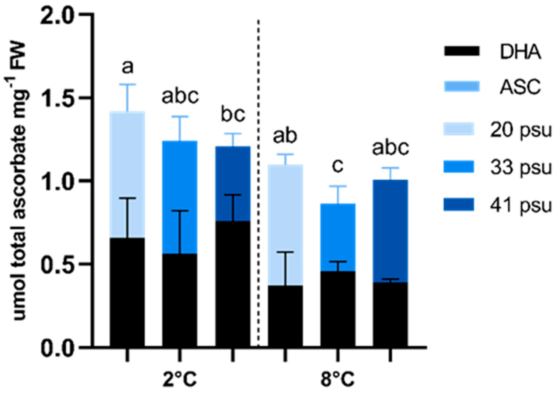 Figure 7. Effect of temperature and salinity on ascorbate (ASC in blue) and dehydroascorbate (DHA in black) in A. utricularis. Both parameters were determined at 2 °C (control) and 8 °C, at three salinity levels: 20 (hyposaline), 33 (control), and 41 psu (hypersaline). The data are presented as mean ± SD, with n = 3. Lowercase letters represent significant differences between treatments (p < 0.00073).