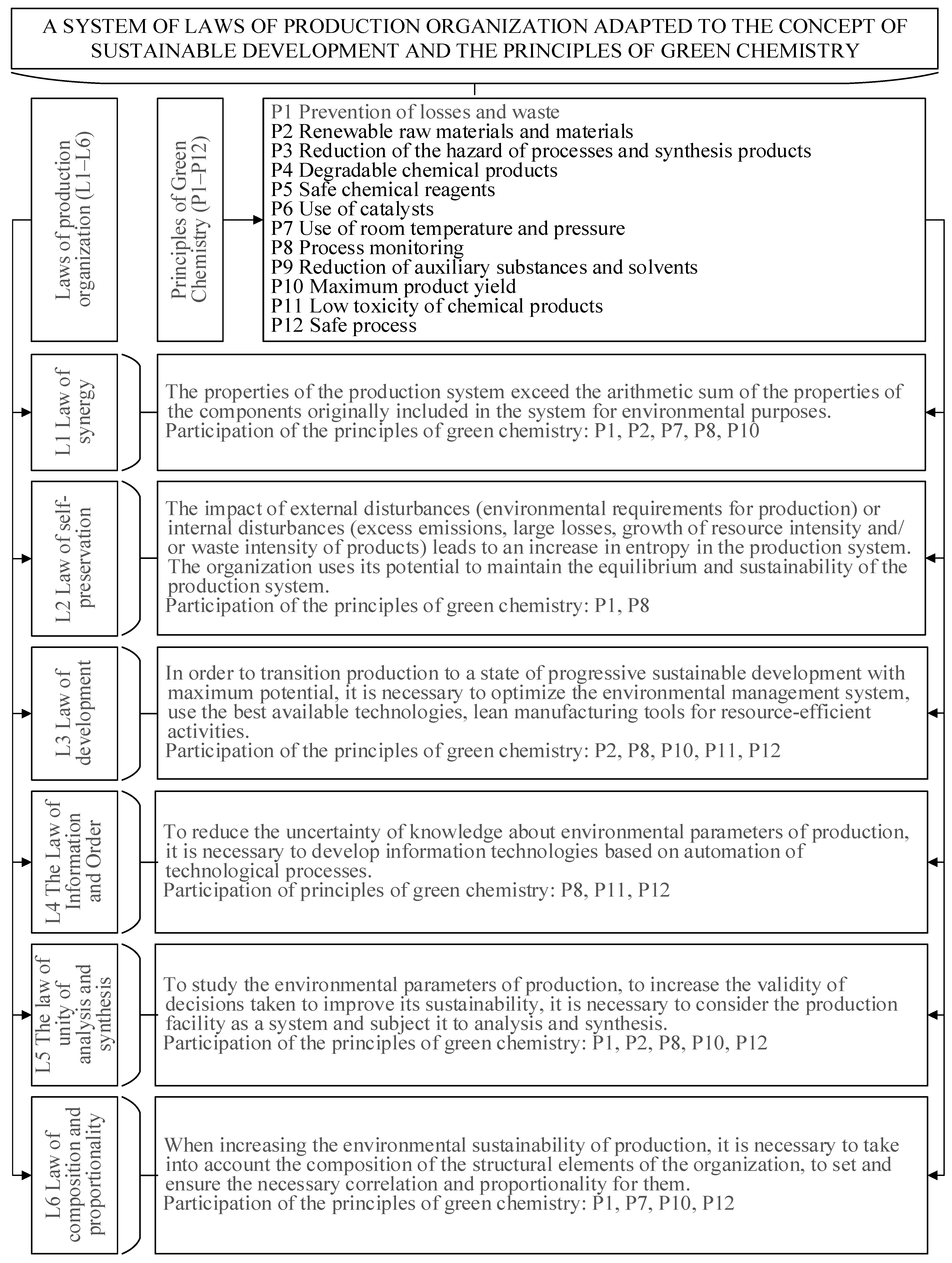 Interpretation of the laws of production organization in the projection of “green” chemistry allows the adaptation of the system of laws to the principles of formation of sustainable industries (Figure 1).