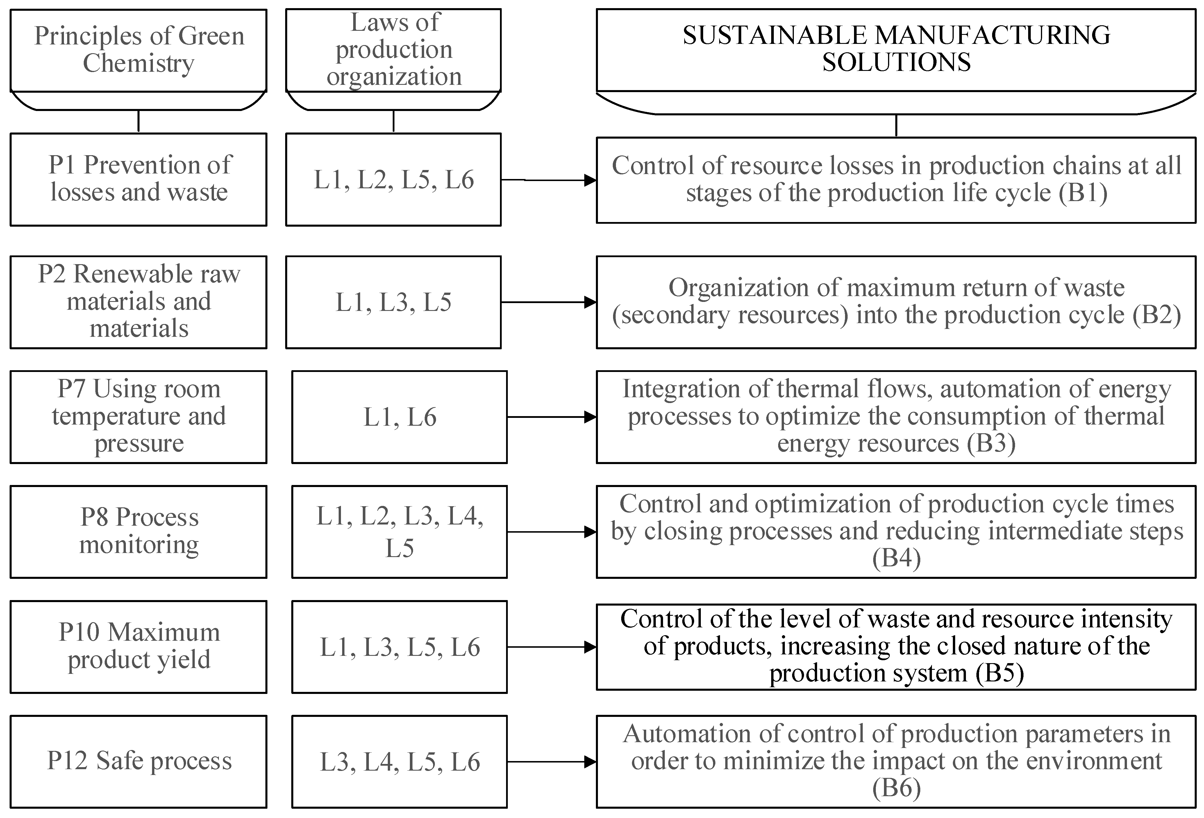 At the same time, an interesting development of green chemistry is the adaptation of the 12 principles to the laws of production organization. The organization of the main, auxiliary, and supporting processes of production allows for the connection of knowledge and labor with the material elements of production so as to ensure the production of high-quality green products on the basis of rational, careful use of resources and means of production.