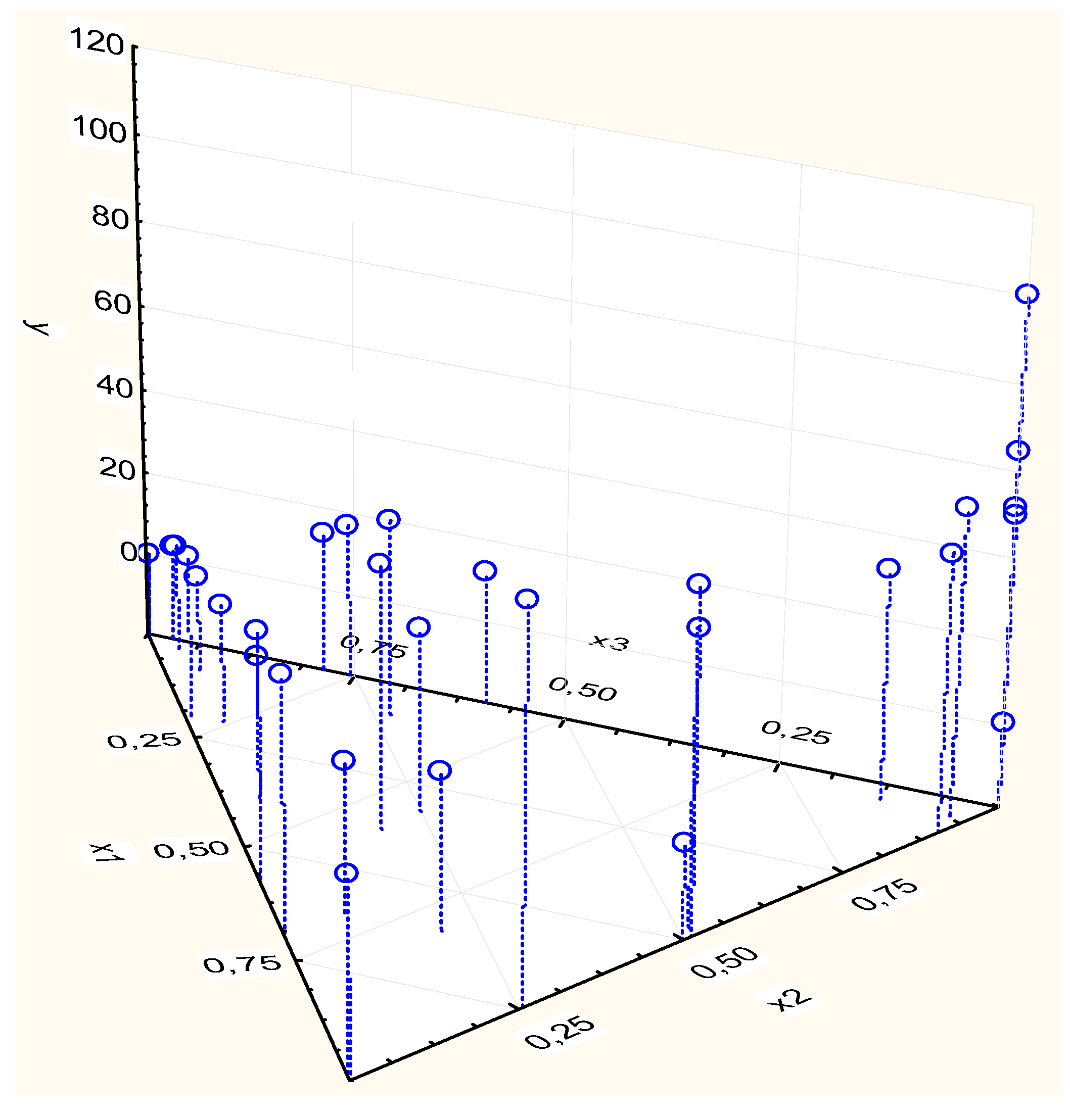 Figure 5. Ternary plot of the study of the dependence of the response “specific gravity of usefully used waste” on predictors x1–x3.