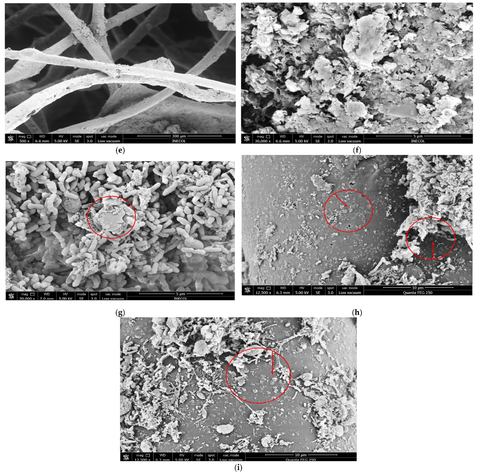 3.2.3. Biofilm Morphology in the Fiber Matrix
