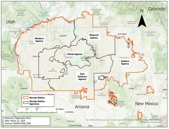 Established in the Four Corners region of the Southwestern United States are the homelands of the Navajo people. The Navajo Indian Reservation, also known as the Navajo Nation (NN), is located within the Colorado Plateau. Primarily a high desert ecosystem, the area is characterized by low precipitation, varying elevations, and diverse geological features like canyons, mesas, and badlands. The NN includes over 27,000 square miles (>71,000 square kilometers), spans across three states (Arizona, New Mexico, Utah) and has been compared to the size of the U.S. State of West Virginia. There are 110 chapters or communities within the NN, which are divided among five management agencies (Western Agency, Chinle Agency, Fort Defiance Agency, Eastern Agency, and Shiprock Agency) [8]. Chapters are the local government subdivisions of the Navajo Nation. The vast geographic land base and large tribal enrollment population of nearly 400,000 make the NN the largest American Indian tribal nation in the United States [9,10]. Approximately 160,000 Navajo people live in the NN, according to the 2020 Census [9]. It should also be noted that the NN has been categorized as a rural area, with a population density of 6.02 people per square mile [9]. Figure 1 provides a map of the NN boundaries and agencies located within the NN.