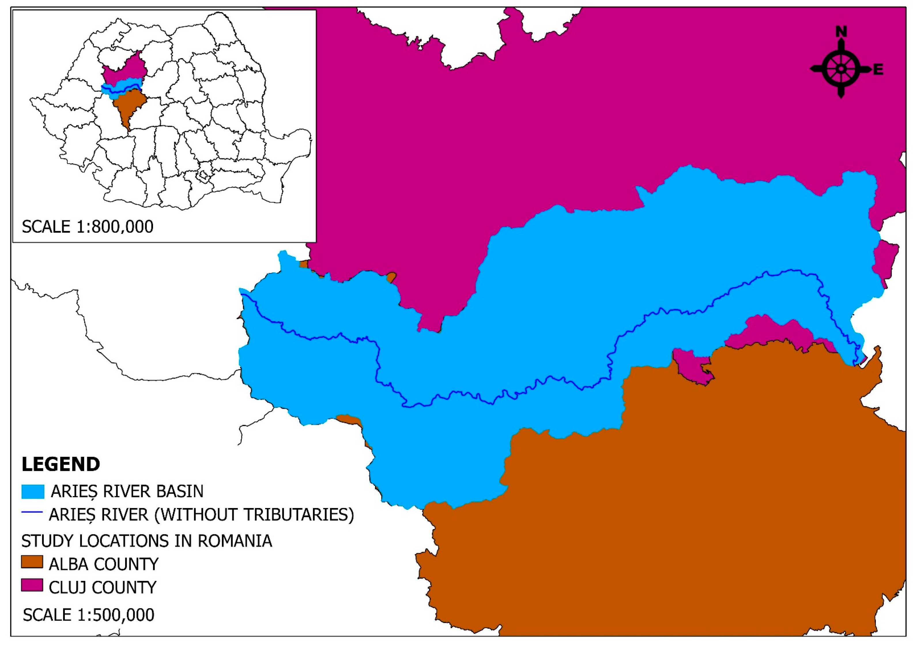 - Butiuc-Keul, A.; Momeu, L.; Craciunas, C.; Dobrota, C.; Cuna, S.; Balas, G. Physico-chemical and biological studies on water from Arieș River (Romania). J. Environ. Manag. 2012, 95 (Suppl.), S3–S8. [Google Scholar] [CrossRef] [PubMed]