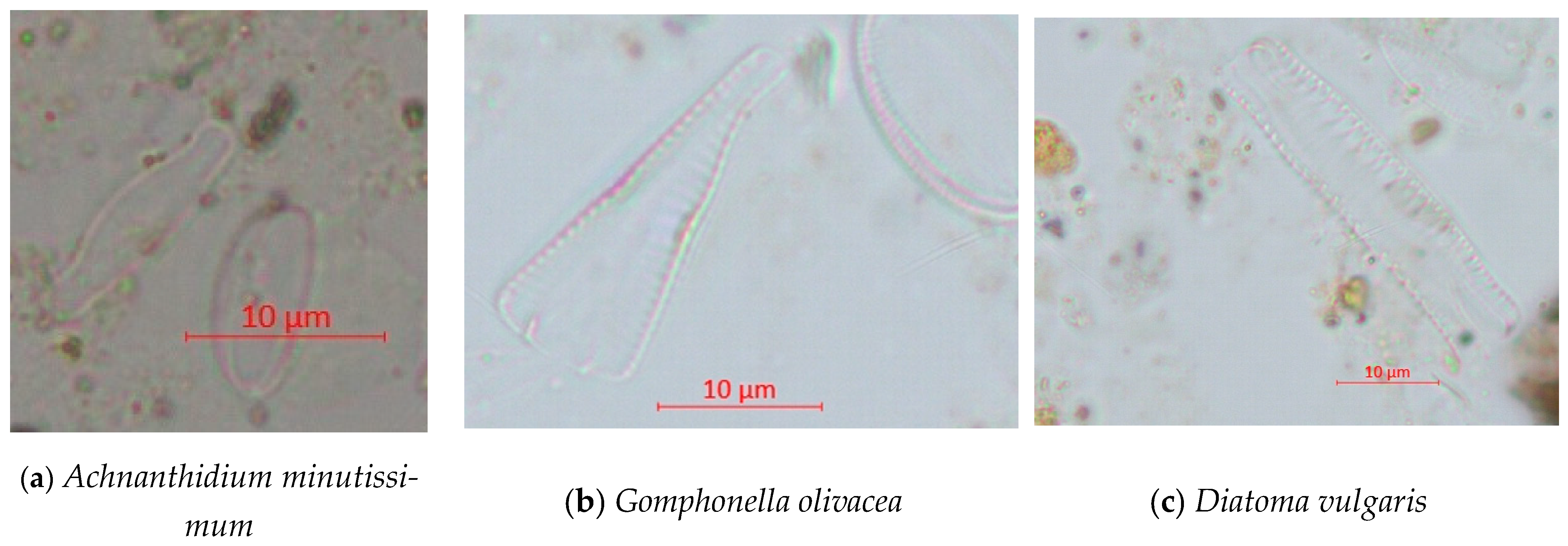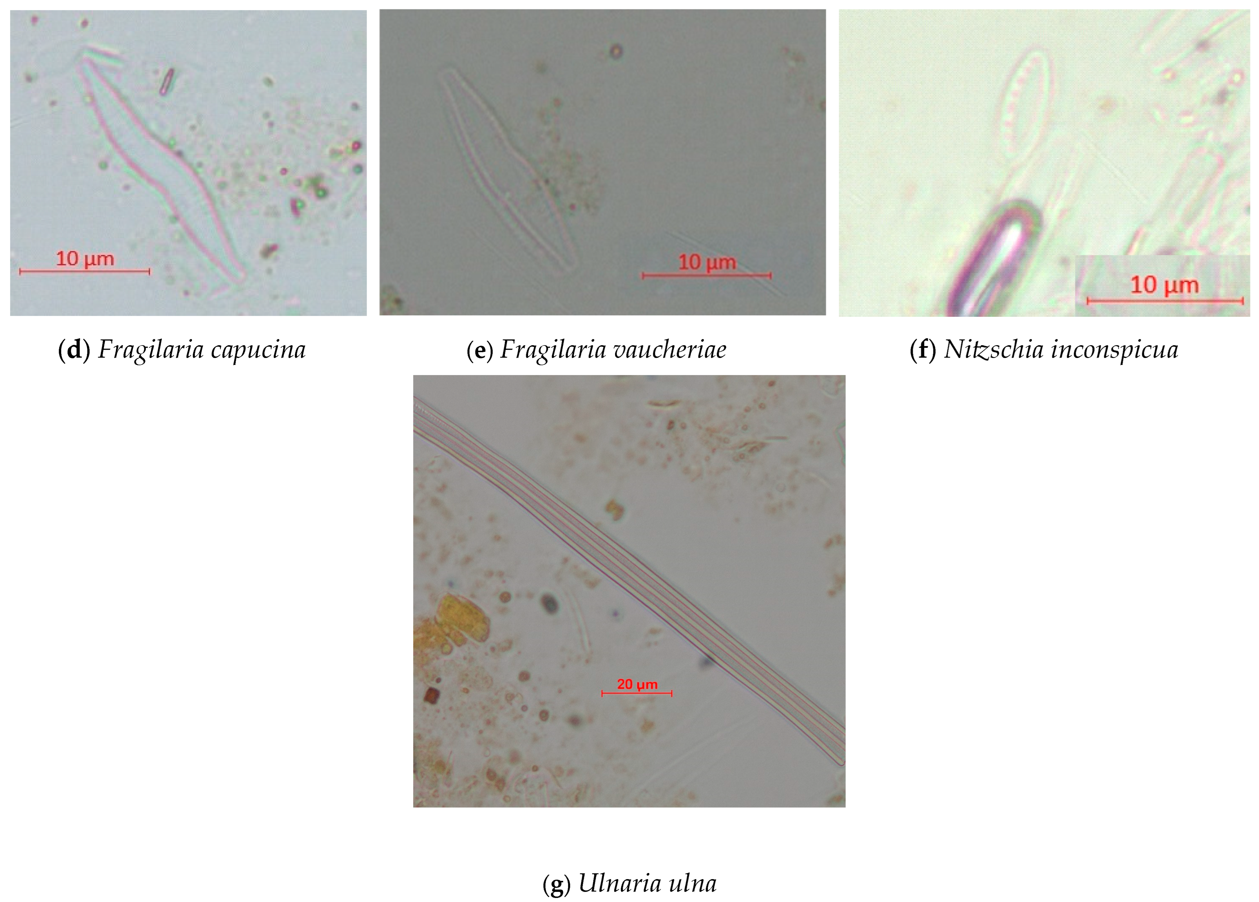 - Taurozzi, D.; Cesarini, G.; Scalici, M. Diatoms as bioindicators for health assessments of ephemeral freshwater ecosystems: A comprehensive review. Ecol. Indic. 2024, 166, 112309. [Google Scholar] [CrossRef]