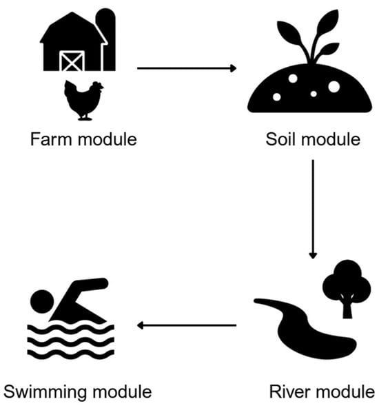 Building on our prior integrated QMRA model linking farm, soil, river, occupational, and foodborne pathways [21,22], we extend the framework to the recreational-water pathway by estimating single-event ingestion doses and DALYs for recreational swimmers at a hypothetical downstream site, alongside sensitivity analysis of key environmental drivers.