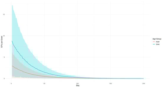Human exposure during recreational swimming (CFU per event) by age group over days since manure application. Lines show the mean; shaded bands show the 95% uncertainty interval (2.5–97.5th percentiles) across 1000 iterations.