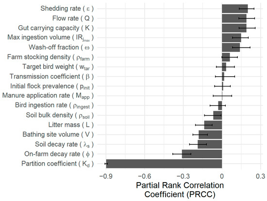 The sensitivity analysis (Figure 3) indicates that the soil–water partition coefficient is the dominant driver (PRCC ≈ −0.90, 95% CI −0.91 to −0.89), implying that stronger sorption markedly lowers planktonic and thus ingestible E. coli at the bathing site. The on-farm decay rate is the second strongest and negative influence (PRCC ≈ −0.31, 95% CI −0.38 to −0.24). Among positively associated factors, on-farm shedding rate (ε; PRCC ≈ +0.20, 95% CI +0.13 to +0.25), broiler gut carrying capacity (K; PRCC ≈ +0.19, 95% CI +0.13 to +0.26), flow rate (PRCC ≈ +0.19, 95% CI +0.13 to +0.25), wash-off fraction (PRCC ≈ +0.14, 95% CI +0.08 to +0.22), and the maximum adult ingestion volume (PRCC ≈ +0.15, 95% CI +0.08 to +0.20) increase exposure. Negative effects are observed for the soil decay rate (PRCC ≈ −0.19, 95% CI −0.25 to −0.12), bathing-site volume (PRCC ≈ −0.18, 95% CI −0.23 to −0.11), litter mass (PRCC ≈ −0.14, 95% CI −0.21 to −0.08), and a small but significant effect of soil bulk density (PRCC ≈ −0.07, 95% CI −0.14 to −0.01). The ingestion-rate parameter shows little influence (PRCC ≈ −0.03, 95% CI −0.09 to +0.03). Parameters linked to flock size, target weight, initial prevalence, transmission coefficient, and manure application rate appear negligible under the tested scenarios [21]. Overall, exposure is most sensitive to hydrodynamic and fate processes, particularly partitioning, decay, and dilution.