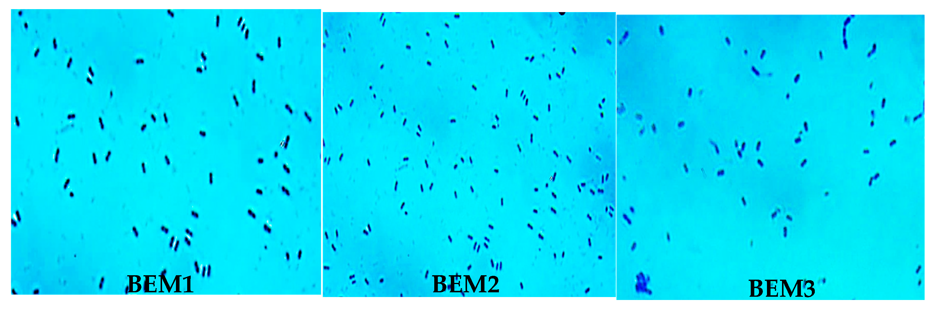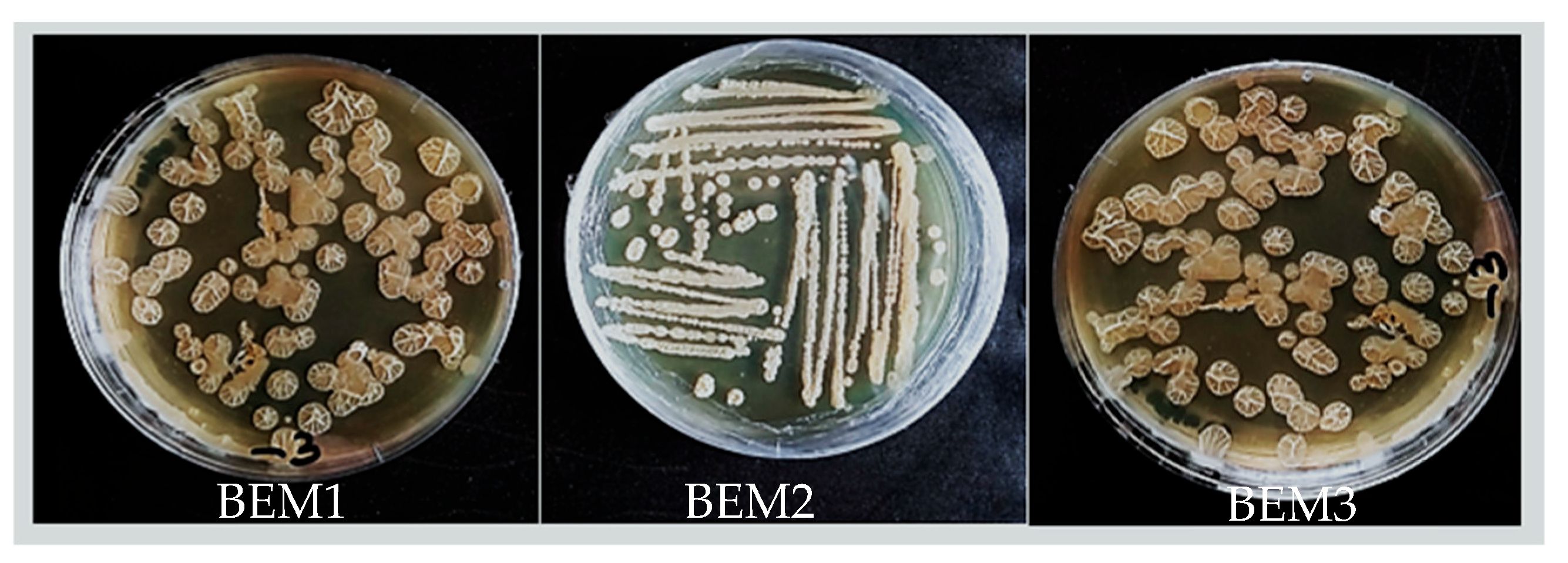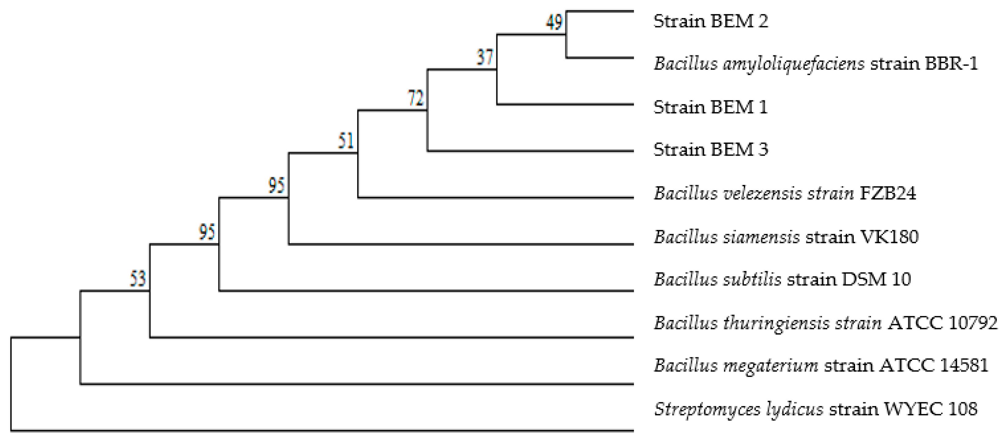 | BEM 1 | PV355678 | Bacillus amyloliquefaciens CP054415.1 | 99.86% | 100 |