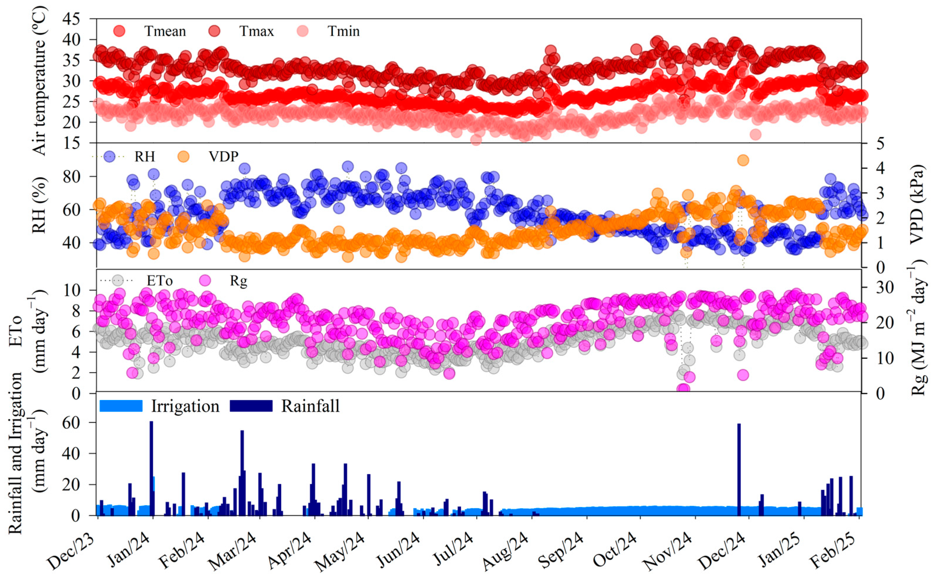 Tr, RH, ΔF/Fm′ and rainfall, and negative correlation with Tair, Tmax, VPD and Rg (