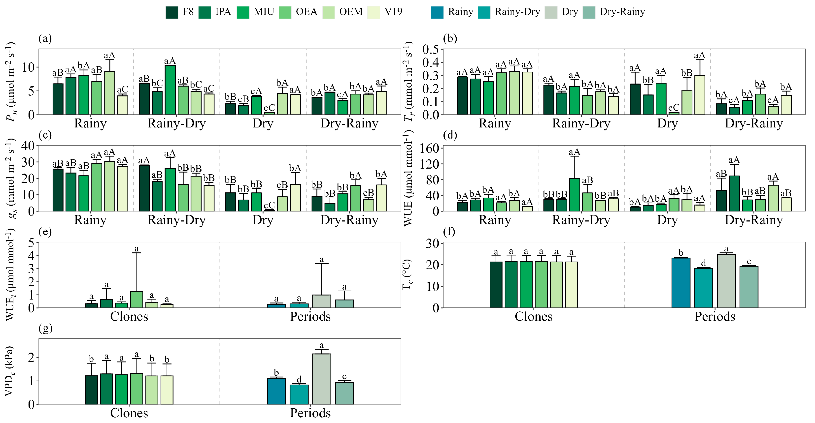 Figure 3e). Clone V19 presents higher WUE values in the rainy–dry and dry–rainy transition periods (32.6 µmol mmol