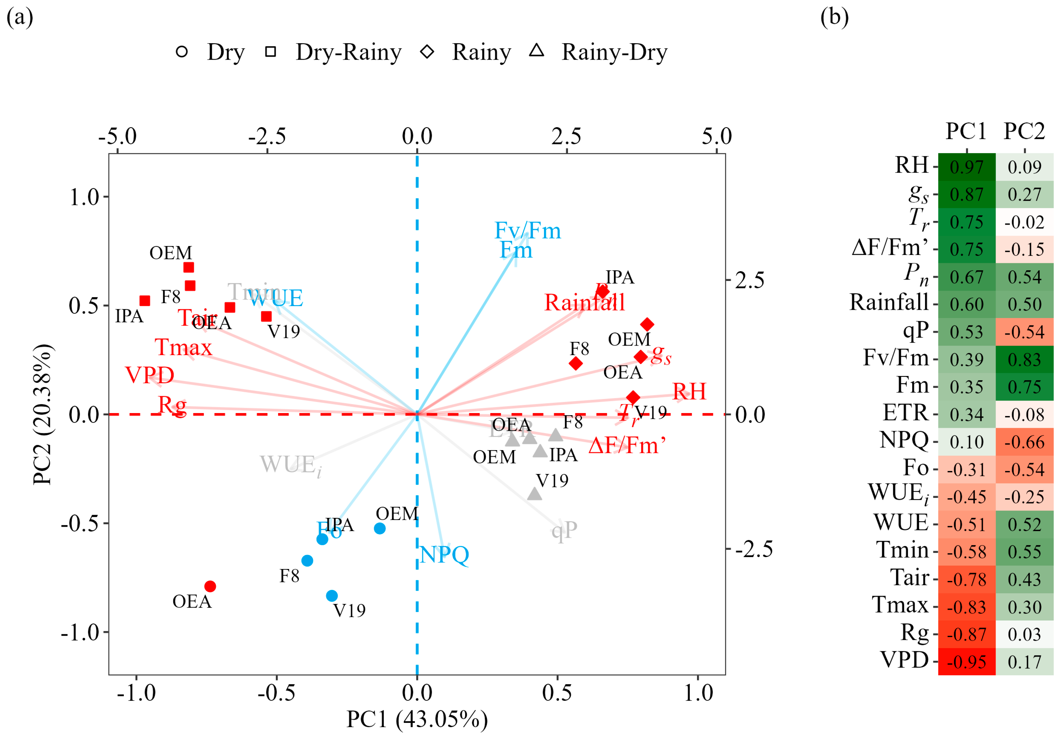 Figure 5). The dry–rainy season showed a positive correlation with the same clones and with the variables Tair, Tmax, VPD, Rg and WUE. During the dry season, the clones IPA, OEM, V19 and F8 correlated positively with the variables Fo and NPQ and negatively with Fv/Fm and Fm (