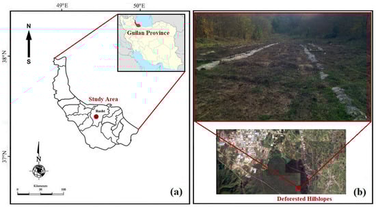 Geographical location (a) and pictures of the deforested hillslopes (b) in the study area (Saravan Forest Park, Guilan Province, Iran).
