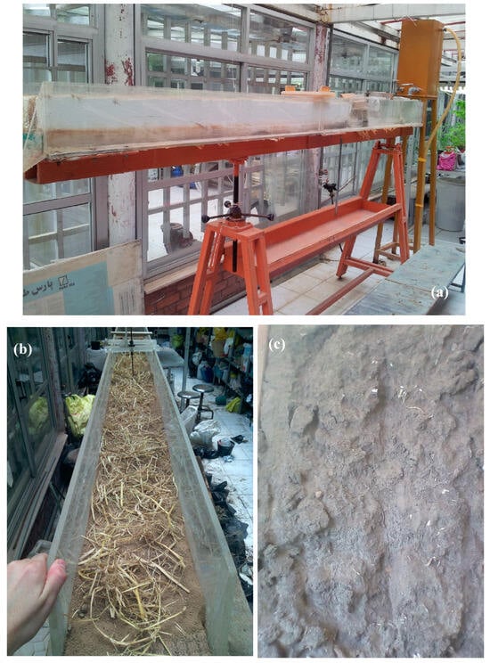 Pictures of the slope-adjustable hydraulic flume (a) used for the experiments, with details of its bed (covered by straw) (b) or left bare (c).