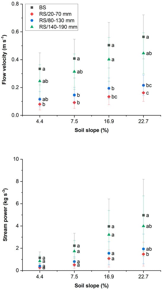 A two-way ANOVA followed by Tukey’s test (p < 0.05) was applied to identify significant differences in the flow velocity, stream power and soil loss (response variables) among the four conditions, with four levels—BS, RS/20–70 mm, RS/80–130 mm, and RS/140–190 mm—and four soil slopes—4.4%, 7.5%, 16.9%, and 22.7% (independent factors). Before ANOVA, the equality of variance and normal distribution of samples were checked using the Shapiro–Wilk and Levene tests, respectively. Both tests demonstrated that the ANOVA assumptions were met. ANOVA and other tests were carried out using OriginPro software, release 2025b, OriginLab Corporation, Northampton, MA, USA.