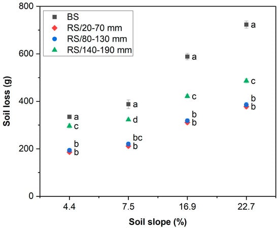 Values (mean ± standard deviation, n = 5 replicates) of soil loss measured in flume experiments for bare soils and sites with application of rice straw with different sizes (study area: Saravan Forest Park, Guilan Province, Iran). Legend: BS = bare soil, RS/20–70 mm = rice straw (20–70 mm); RS/80–130 mm = rice straw (80–130 mm); RS/140–190 mm = rice straw (140–190 mm); different letters indicate significant differences among soil conditions for each soil slope after Tukey’s test (p < 0.05).