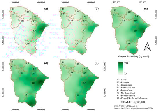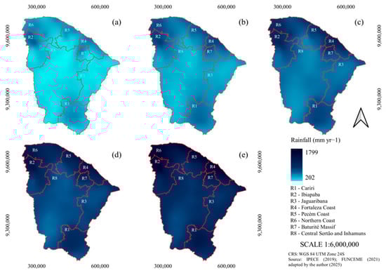 Spatial distribution of the rainfall in Ceará by scenario: (a) very dry; (b) dry; (c) normal; (d) rainy; (e) very rainy.