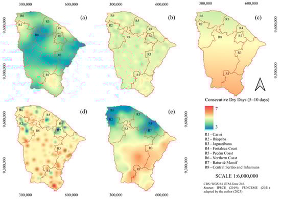 In the very dry scenario, there were between three and five CDD1 events, which were more frequent in the coastal area of Fortaleza and in Cariri (Figure 6a), regions that differed statistically from Jaguaribana (Table 4). This can be attributed to the fact that in these regions, the greatest volume of rainfall is concentrated in the very dry scenario (Figure 5a). The smallest number of CDD1 events was recorded in the central, eastern, and northwestern regions of the state, or more precisely, in parts of the Central Sertão and Inhamuns and Jaguaribana. It is important to remember that in years of reduced rainfall, the lower occurrence of short CDDs suggests an increase in prolonged drought events [24,36,76].
