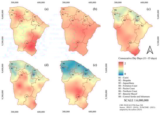 Under the rainy (Figure 7d) and very rainy (Figure 7e) regimes, there were from zero to two CDD2 events. Cariri and Central Sertão and Inhamuns differed from the other homogeneous rainfall regions, with the exception of Jaguaribana. There was a reduction in the number of CDD2 events in the coastal and mountainous regions as water availability increased, with the Central Sertão and Inhamuns and Cariri regions being the most affected by CDDs lasting from 11 to 15 days.