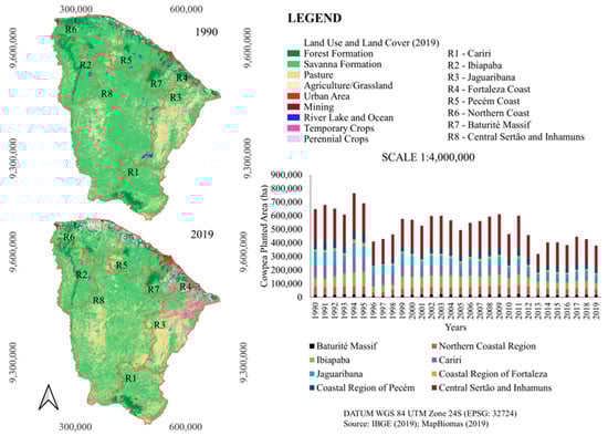Additionally, to complement this information, the land use and land cover dataset from the MAPBIOMAS project for the years 1990 and 2019 was used, aiming to visualise the spatial arrangement of cultivated areas in the state of Ceará [51].