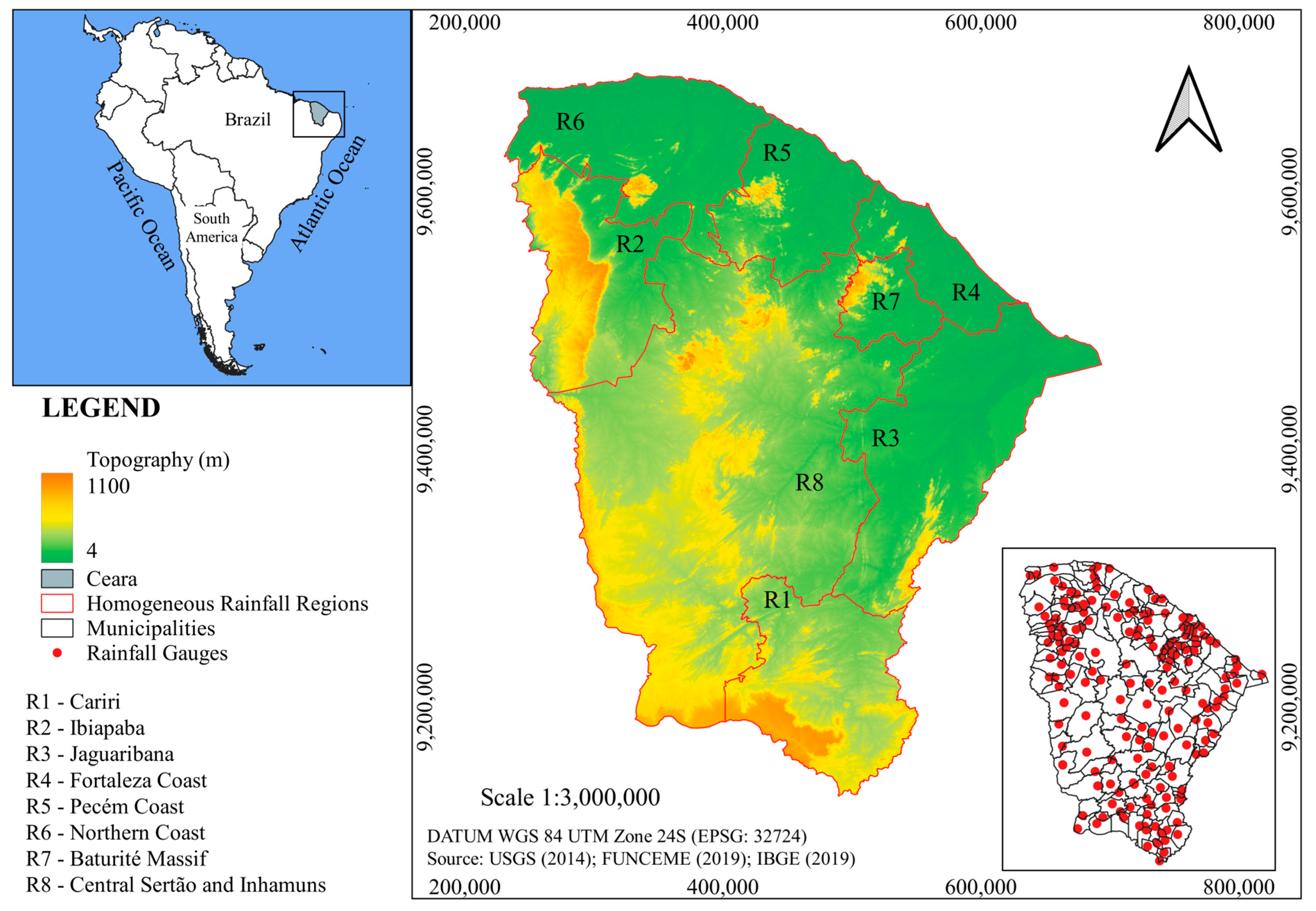 - Guerreiro, M.J.S.; Andrade, E.M.; Abreu, I.; Lajinha, T. Long-term variation of precipitation indices in Ceará State, Northeast Brazil. Int. J. Climatol. 2013, 33, 2929–2939. [Google Scholar] [CrossRef]